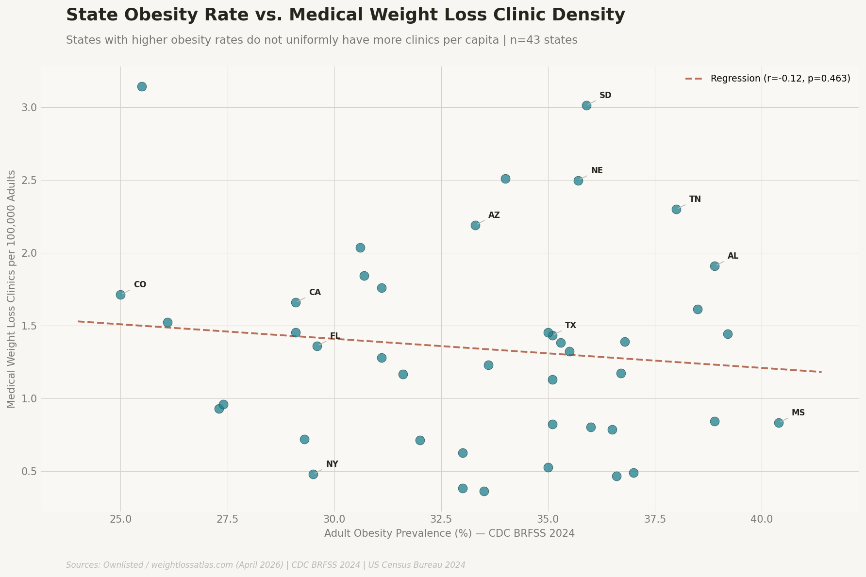 An original data study mapping 3,039 active medical weight loss clinics across 44 US states — with a full 50-state access gap analysis, GLP-1 adoption data, and the geographic mismatch between where obesity is highest and where clinics actually exist.